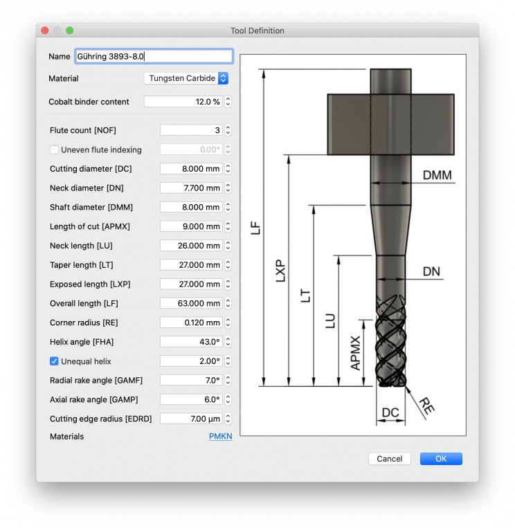 Millalyzer's tool definition interface is entirely open, the built-in tool editor lets you quickly define new endmills. Choose to define only the most important properties or enter all detail dimensions for accurate chatter analysis. Tool library files are plain-text files in YAML or CSV format, and can be saved and loaded freely.