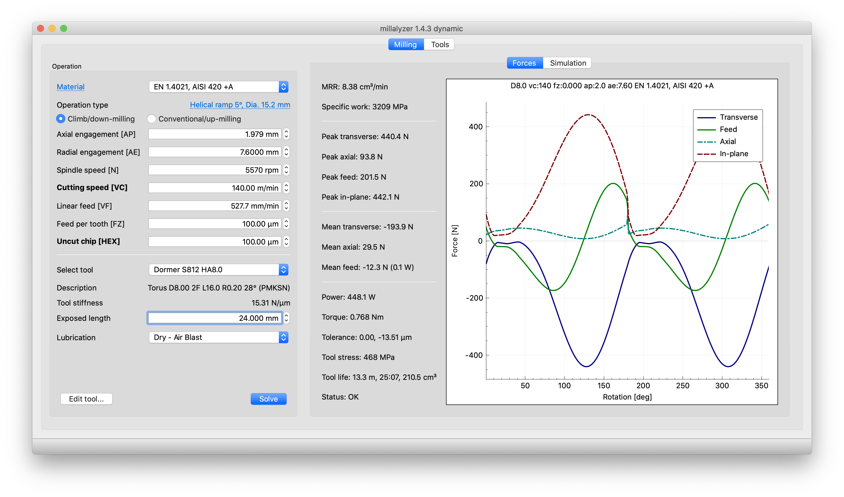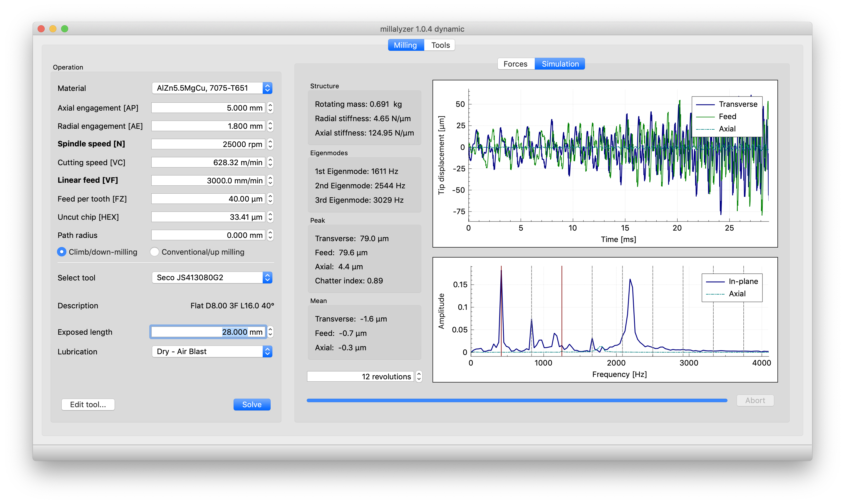 Millalyzer predicts milling forces and recommends machining parameters based on material properties and machine limitations.
